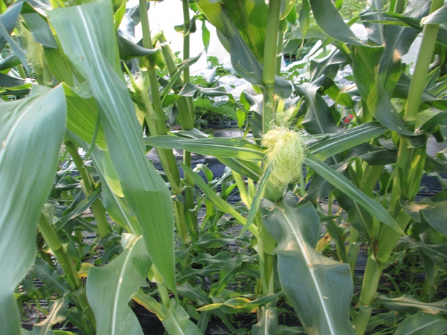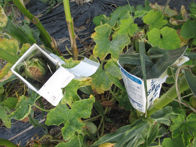 添付した写真をご覧ください。ご覧の通り、トウモロコシの雌穂(めすほ)の部分に、丁寧に加工した牛乳パックを被せています。