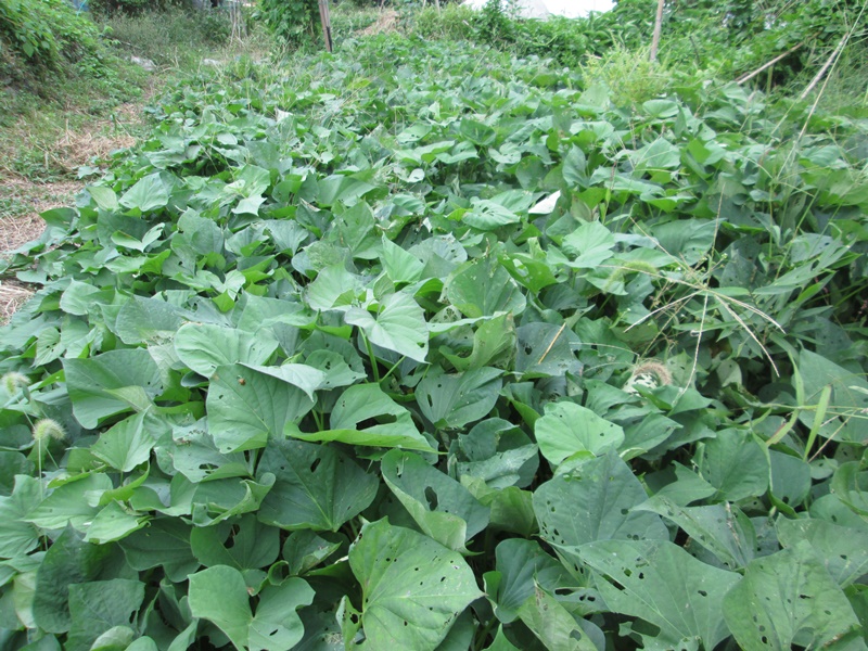 「今年も、福竹ファーム(うちの畑)では、こんなに立派なサツマイモのツルがモリモリと育っています!」